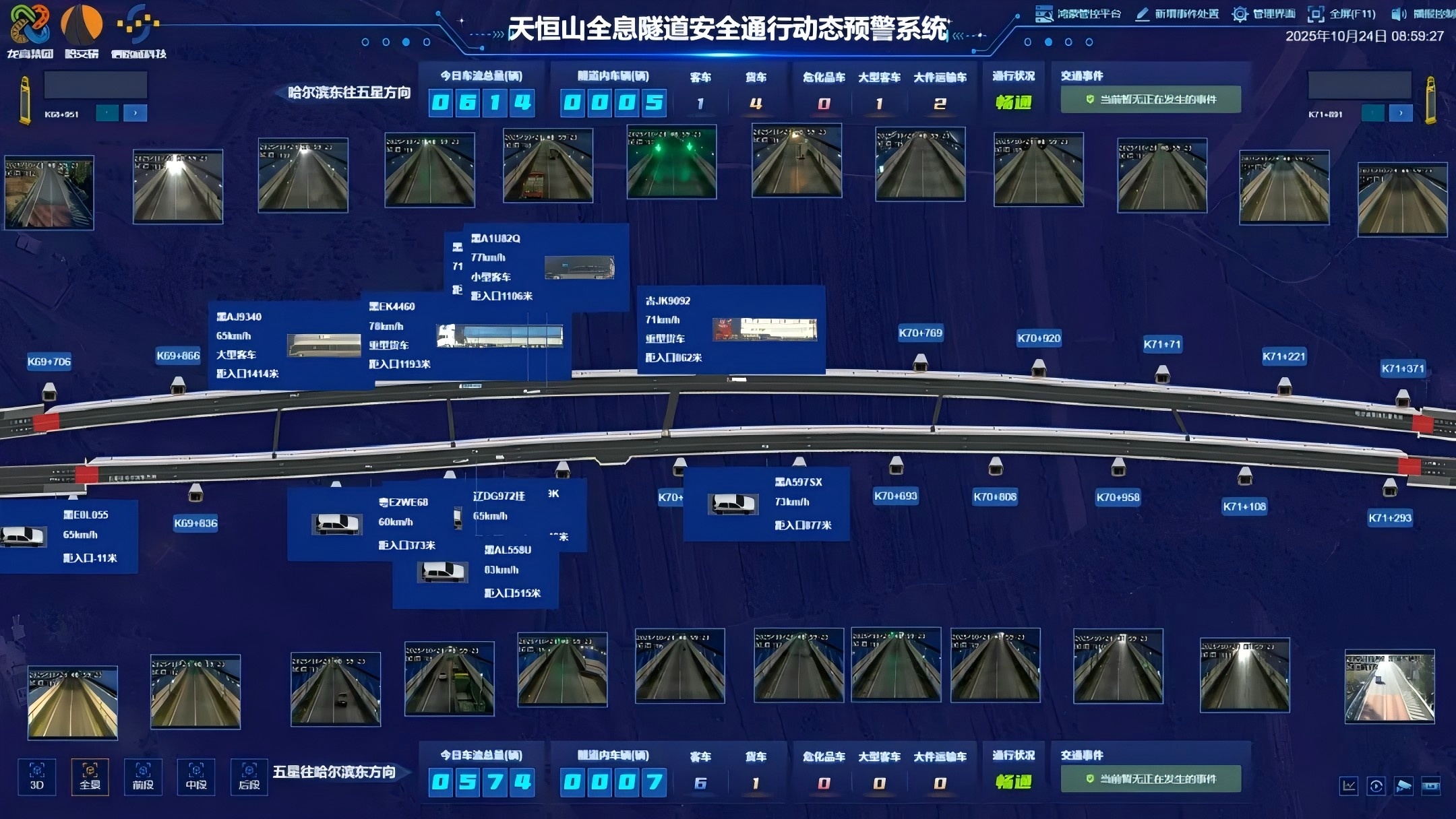 該系統(tǒng)由哈爾濱交研交通工程有限責(zé)任公司實施,北京信路威科技股份有限公司提供技術(shù)支持,于2022年國慶節(jié)假期前完成隧道單洞部署并投入使用,取得立竿見影的效果,2024年實現(xiàn)雙洞投用運營,2025年再次完成功能完善和升級,優(yōu)化了后臺算法和前臺界面,使操作、展示更為直觀,效率明顯提升。在多次考察調(diào)研過程中,該系統(tǒng)創(chuàng)新的管理理念、完善的平臺功能和顯著的展示成效獲得上級領(lǐng)導(dǎo)和同行業(yè)單位的廣泛認(rèn)可與學(xué)習(xí)借鑒。